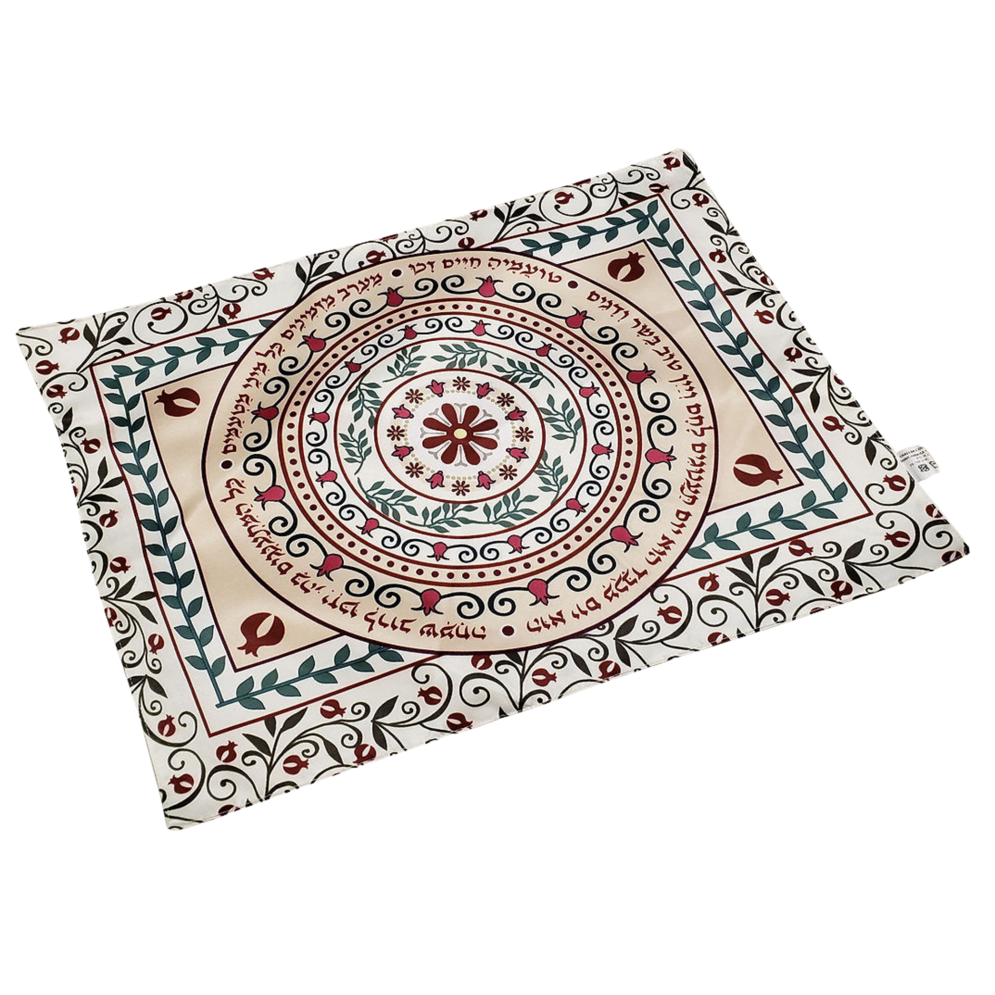 מפית חלה בדוגמת מנדלה צבעונית עם כיתובים מזמירות שבת "כל המתענגים בה יזכו לרב שמחה", "הוא יום מכובד הוא יום תענוגים, לחם יין טוב, בשר ודגים", "טועמיה חיים זכו", "מערב מזמינים כלי מיני מטעמים